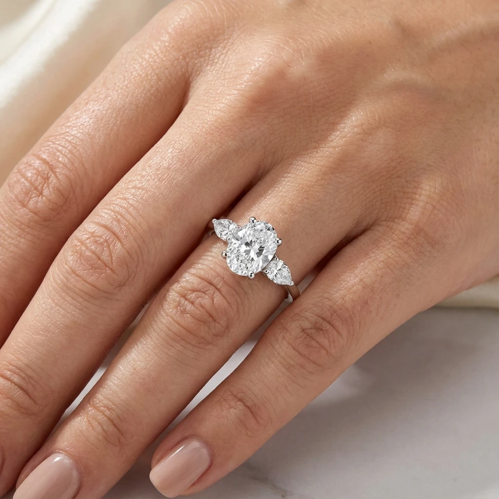 טבעת אירוסין "טריו" יהלומים משובצת יהלום אובל מנצנץ מלווה ב 2 יהלומים בליטוש טיפה מצדדיו, טבעת אירוסין אלגנטית עם נוכחות ושיק מיוחד.