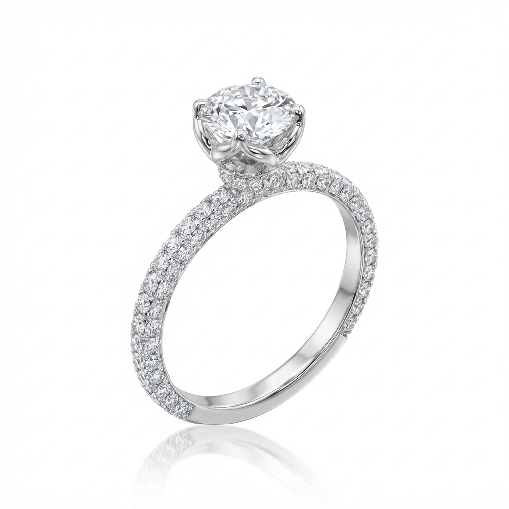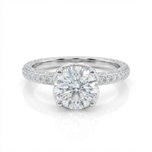 טבעת אירוסין יהלום עגול 1.5 קראט מעבדה עם יהלומים משובצים בפרופיל ובצידי החישוק זהב לבן 14 קראט
