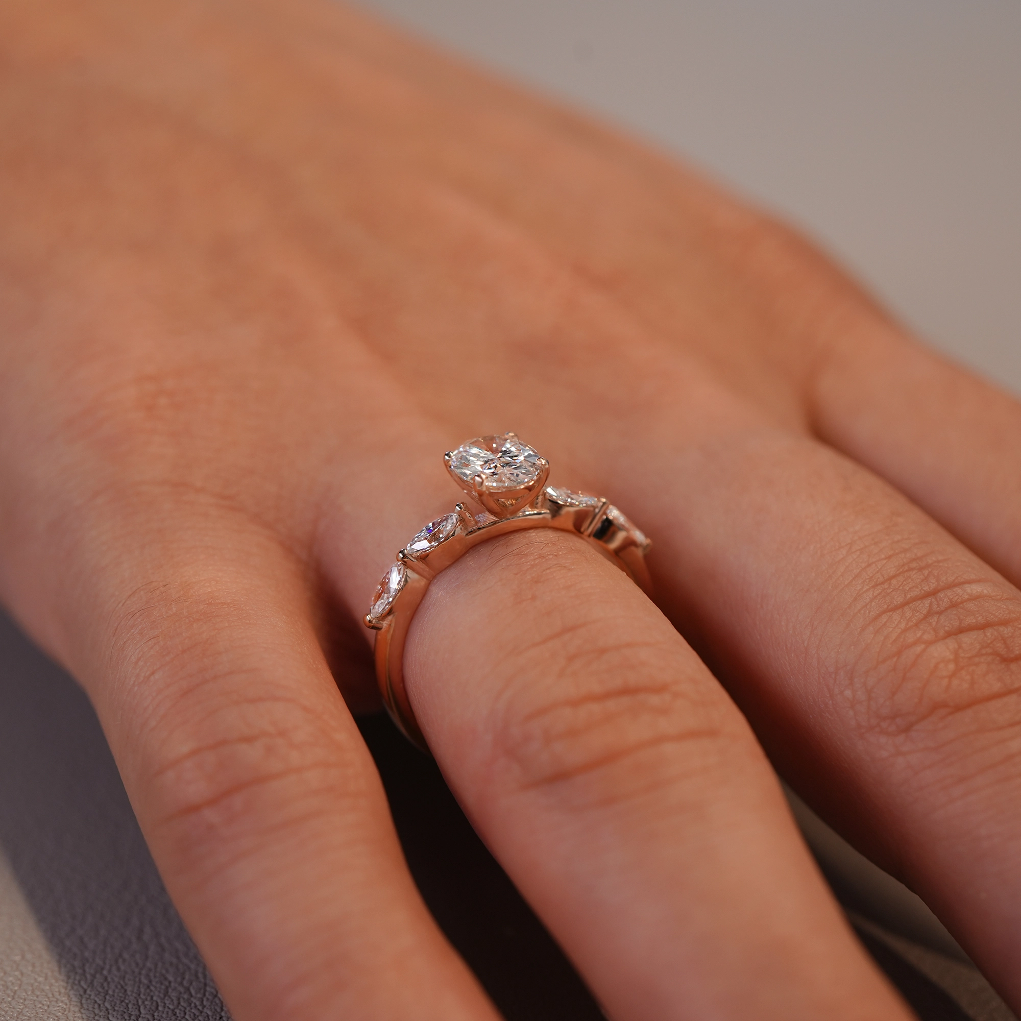 לצידי היהלום המרכזי על גוף הטבעת משובצים יהלומים נוספים בצורת מרקיזות במשקל כולל של 0.20 קראט, בצבע D-F ובניקיון VS, היוצרים מראה עשיר ומיוחד.