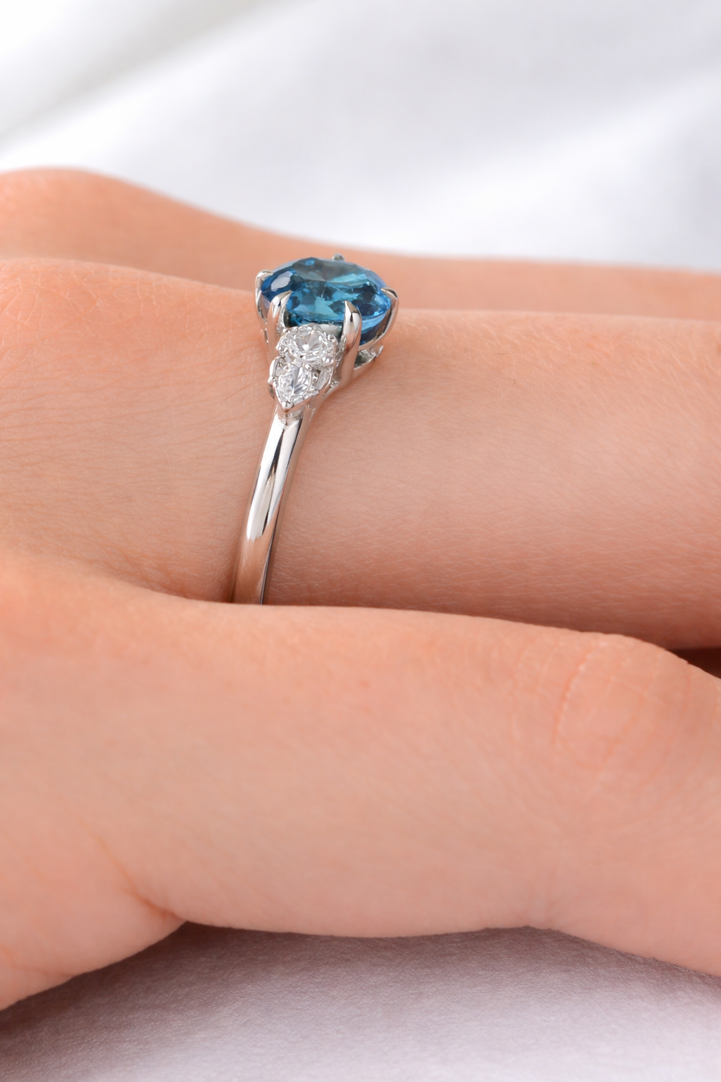 טבעת אירוסין עדינה וייחודית זהב לבן 14 קראט עם יהלום אובל כחול מעבדה