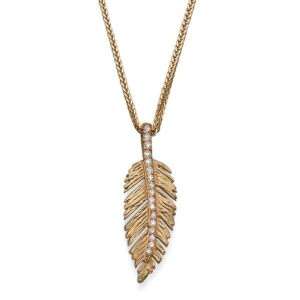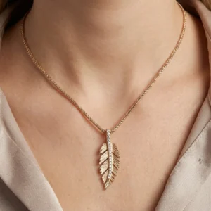 ענק יהלומים עוצר נשימה מבית Gispan Diamond: תליון נוצה/עלה עדין, עשוי מזהב 14 קראט, המשובץ ב-20 יהלומים לבנים טבעיים ונוצצים. כל יהלום נבחר בקפידה ועומד בסטנדרטים הגבוהים ביותר של איכות – צבע D-F וניקיון VS, במשקל כולל של 0.12 קראט.